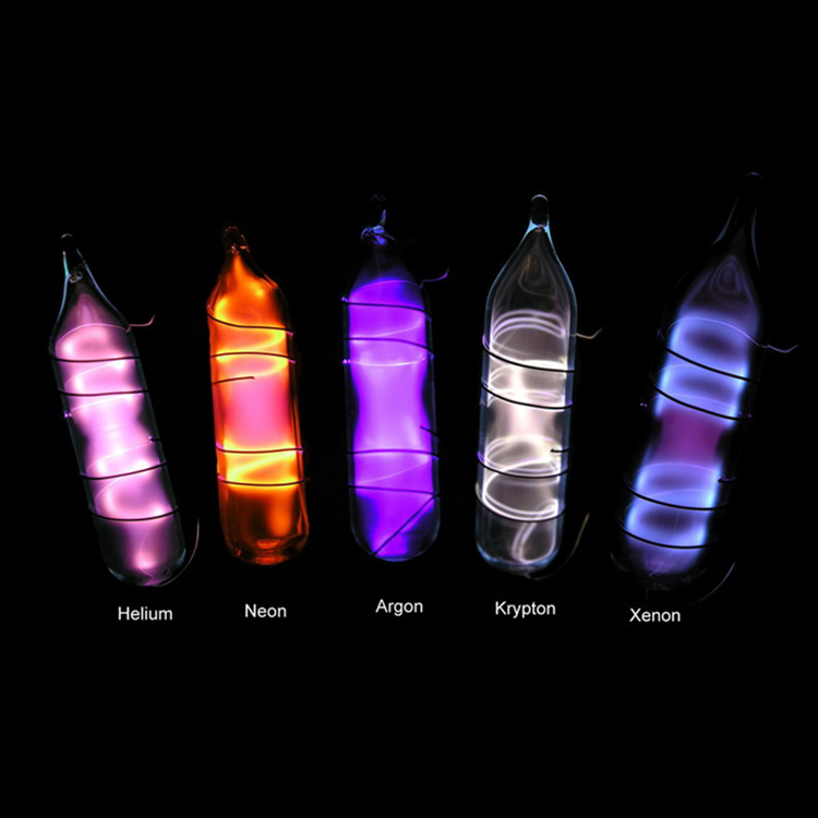 不同的氣體在不同的條件下會發(fā)出不一樣的光,一般氦氣—-橘紅 ,氖氣—-紅,氬氣—-藍紫氪氣—-黃綠,氙氣—-與陽光顏色相同。